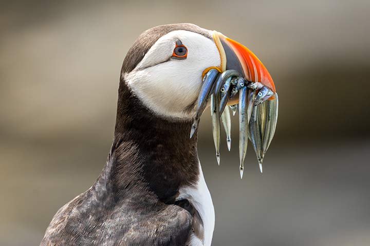 Der Papageientaucher nimmt den Mund gerne mal zu voll, und zwar wortwörtlich. Selbst wenn er schon mehrere Fische in seinem großen, dreieckigen Schnabel hält, schafft er es trotzdem noch weitere zu erbeuten. Sein Trick: Er drückt die Fische mit der Zunge gegen gekrümmte Dornen im oberen Schnabel. Die Dornen halten die Fische fest, als würden sie an kleinen Angelhaken sitzen. Der Rekord für die meisten Fische im Schnabel liegt 62 Stück.
